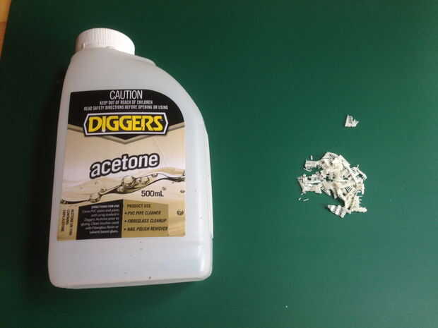 Lo que usted necesita: 1. acetona (¡ ADVERTENCIA! LA ACETONA ES ALTAMENTE INFLAMABLE). 2. algunos chatarra ABS 3. Cepillo 4. Envase de cristal