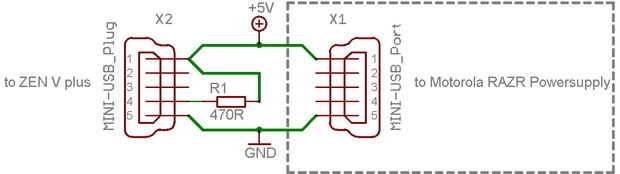 Para mí he hecho un adaptador (véase el cuadro 1, 4 y 5) para utilizar mi motorola RAZR fuente de alimentación (ver figura 1).