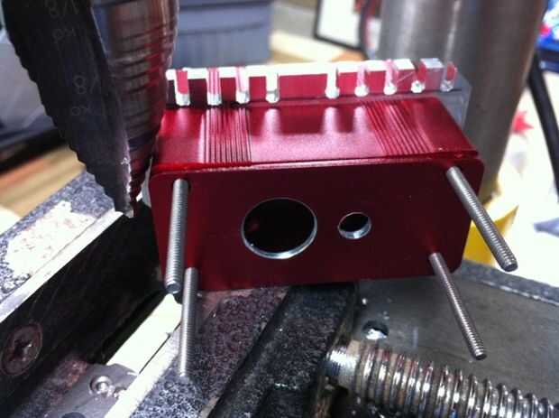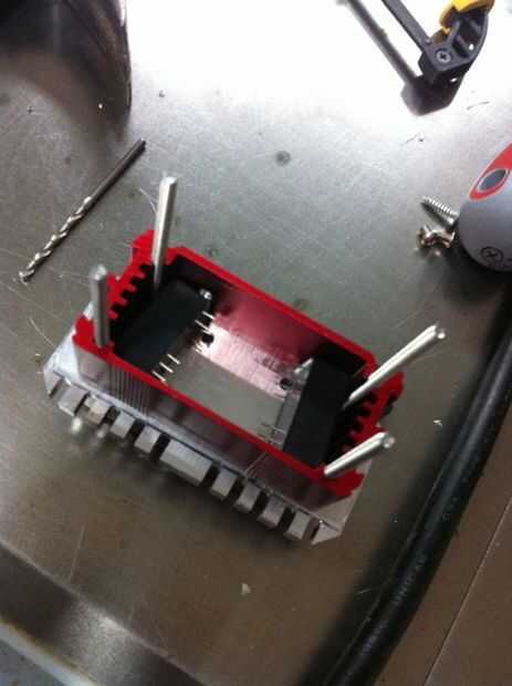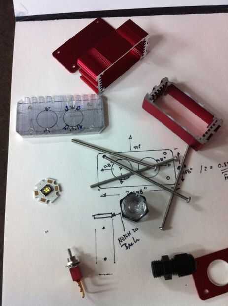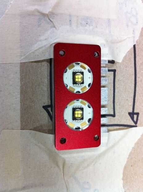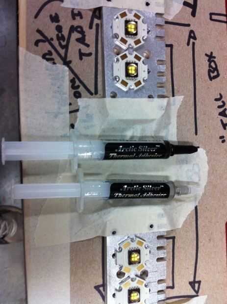 Alinee el LED con los agujeros sobreponiendo el material - use artic silver para pegarlas.  Ajuste el conjunto que en seco.  También - la única parte que compré de Fastenal fueron los tornillos largo y muy flacos - he aprovechado y perforado en el pasado pero esto fue por mucho un mejor enfoque.