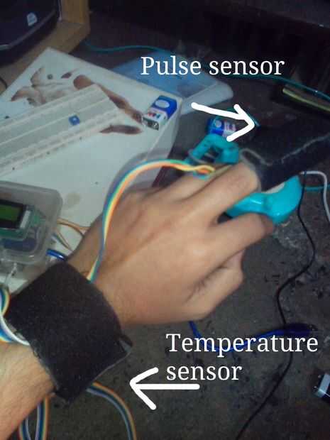 El módulo del sensor consiste en un pulso cálculo de sensor que está en el dedo y un termómetro que mide el sensor en la muñeca.