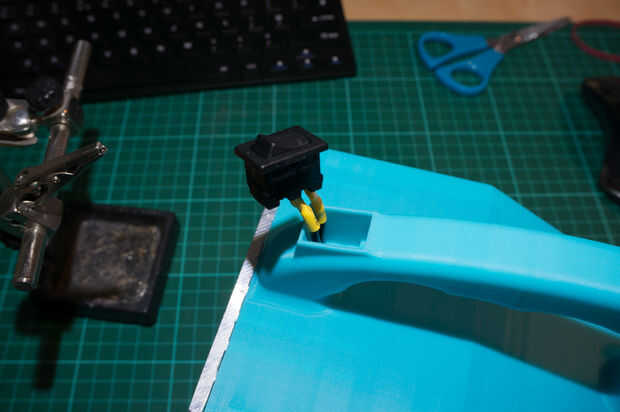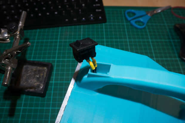 Harto de los cables en la desconexión del interruptor en el caso principal. Puso de encogimiento de calor alrededor de los cables soldados a los terminales del interruptor y usa una pistola de calor en el encogimiento del calor para reducirlo y evitar posibles cortocircuitos.