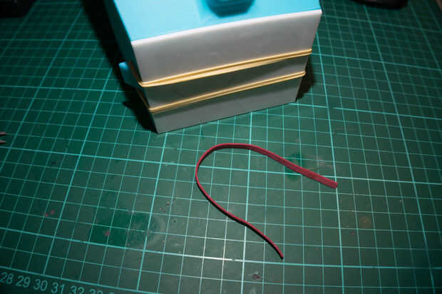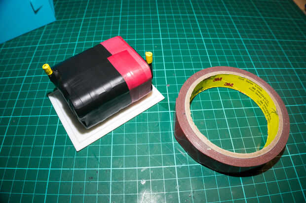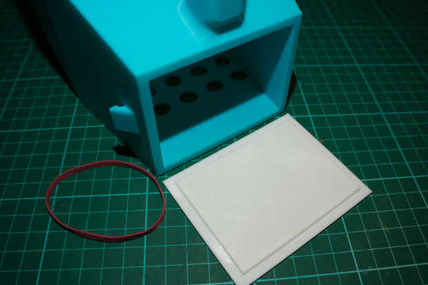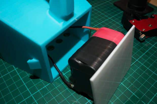 La batería se une a esta cubierta impresa con cinta doble cara espuma de 3m por lo que no no. La batería se puede conectar entonces a la lámpara con los conectores de bala y la tapa se puede cerrar. Una banda elástica fuerte entonces fue utilizada para sostener firmemente con los estirones que hablé anteriormente que se diseñan en el lado de la caja.
