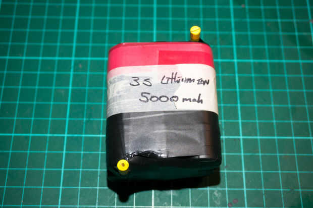 Loco una batería de iones de litio pack de una vieja batería del ordenador portátil. Desmonté todo y luego tabular utiliza alambre para conectarlos hasta forma un compacto 12.6v (3s) batería de 5000mah. Yo entonces había soldado algunos conectores de 3,5 mm bala a los polos positivo y negativo de la manada. Esto es así puede ser fácilmente desconectado y conectado a la antorcha.