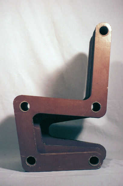 De la silla basculante cartón, las seis piezas continuas en el exterior fueron laser-corte de 1/4" conglomerado. Intercale una gruesa capa de dos pulgadas de cartón corrugado. El interior no son continuos; cada una consta de cuatro piezas de striaght enclavijado y pegados juntos. He usado muchas colas en estas sillas, pero llano viejo pegamento blanco o pegamento de madera funcionan mejor, son los más baratos y fáciles de limpiar.