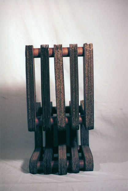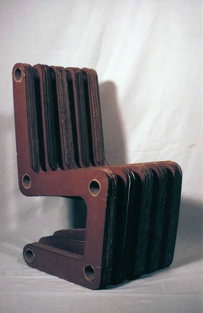 El cartón corrugado soporta el peso de la modelo, mientras que el acto de piezas de aglomerado como refuerzos para evitar que la espalda de lagrimeo como el sitter se inclina hacia atrás. Las secciones de las piezas también conseguir más gruesas hacia el centro con el fin de poner más donde hay más peso. Tubos de impresión mencionados sujetan las piezas sin ninguÌ n pegamento, apenas fricción. Unas capas de poliuretano a extender la vida útil de la silla y darle un bonito acabado liso.