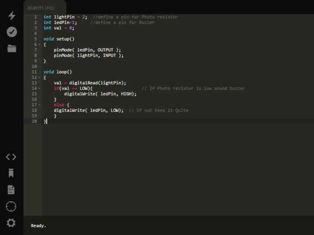 <p>int lightPin = 2; //define a pin for Photo resistor<br>int ledPin=1; //define a pin for Buzzer int val = 0;</p><p>void setup() { pinMode( ledPin, OUTPUT ); pinMode( lightPin, INPUT ); }</p><p>void loop() { val = digitalRead(lightPin); if(val == LOW){ // If Photo resistor is low sound buzzer digitalWrite( ledPin, HIGH); } else { digitalWrite( ledPin, LOW); // If not Keep it Quite } }</p>