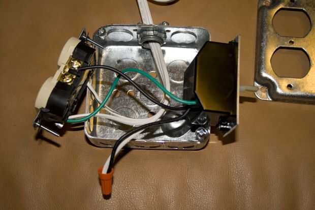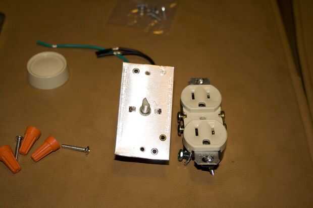 8. conectar los componentes. Aislar el cable negro (vivo) de su coleta (mina fue convenientemente marcado con aislamiento negro bajo el blanco) y colocar a uno de los cables negros del atenuador con la tuerca para alambre incluida. A continuación, tome el otro cable negro y fíjelo al lado de tornillo de latón de la salida (si miras muy cerca en la parte posterior de la salida, que verás que dice "caliente" en el lado de latón). Ahora, aislar el cable blanco (neutro) de su coleta y colocar al lado de la salida del tornillo plateado. Finalmente, envuelva el cable de tierra de la coleta y el cable de tierra desde el dimmer juntos y conecte al terminal de tierra en la salida. Eso es todo! Si tenes confundido el regulador viene con un diagrama de cableado. A sustituir la bombilla para una toma de corriente y eres bueno para ir.