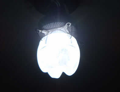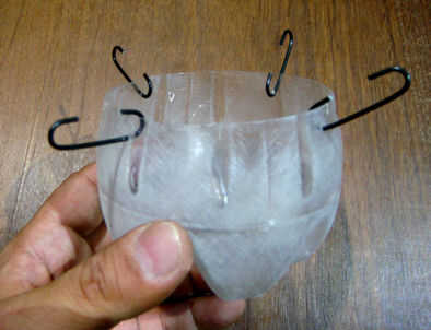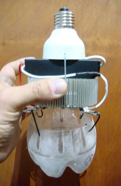 Cortar la base de una botella de PET de 2L y arena grueso. Hacer cuatro agujeros y poner los cables poco gancho en ellos. Ahora ajuste el difusor por debajo de la lámpara del LED y voilá! Eres el primero en el bloque para tener una lámpara retro-futurista de 10W!