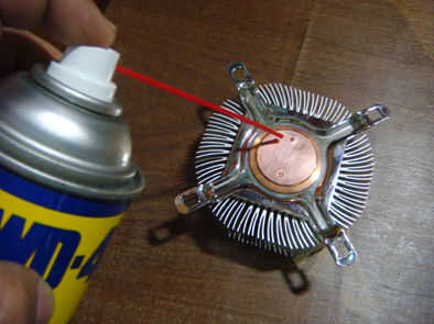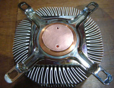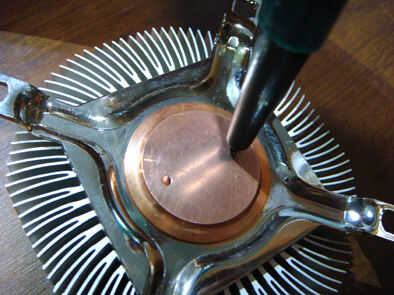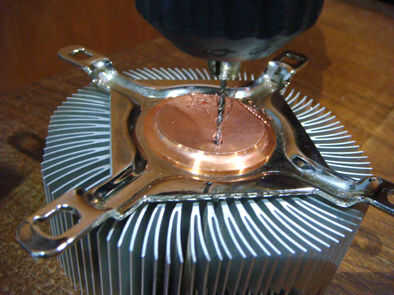Deje caer un poco de aceite y hacer los agujeros con la taladradora. Elegir un taladro un poco más pequeño luego los tornillos. Harán el tornillo al apretarlo en el metal suave del enfriador (cobre o aluminio).