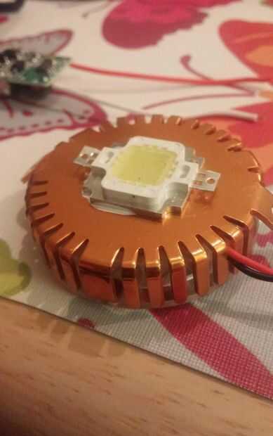 Primero, limpia el disipador de calor y parte posterior del LED con alcohol isopropílico. Añadir una pequeña cantidad de compuesto disipador térmico y el led. Sólo he utilizado pegamento caliente pero realmente debe atornillar el LED del disipador de calor.