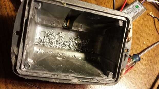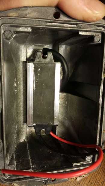 Dentro de la caja de luz son 2 pezones pequeños para los tornillos de fábrica. Son en mi camino, por lo que utiliza brocas de gran tamaño para eliminarlos. Tenga cuidado de no ir todo el camino a través de la carcasa. No tienen que ser perfecto, pero la descarga más, mejor. Los pilotos que llego a suceder para caber casi perfectamente en el hueco natural de esta vivienda tan instalación como en cuadro 7. Aún sobresale un poco, pero no un mal ajuste. ASEGÚRESE DE MARCAR QUE LOS CABLES SON SU CARGA Y NUETRAL ANTES DE PROCEDE. Tome el reflector y volver a colocar en la caja. Se pegará encima de demasiado a colocar la tapa frontal en, asi me funciona abajo a encajonar el conductor. Fotos 8 y 9. No la cosa más bonita siempre, pero funciona. Luego retire el reflector y cortar como se ve en la figura 10 para hacer "los dedos". Cuando termines con eso, coloque el reflector en la comercialización de vivienda que al conductor que llevó los cables fuera de alguna manera como yo lo hice en el cuadro 11