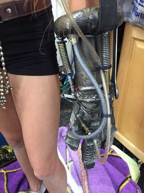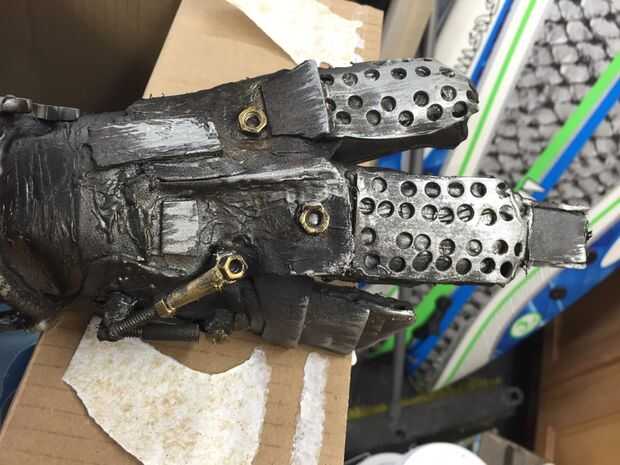 A continuación tienes un guante viejo y había grabado juntos los dedos correspondientes. Hice formas básicas con cinta gorila mientras mi hija perforó agujeros en una pieza de espuma fina con una perforadora. :) Había cortado el dedo "metal" a la medida y caliente pegué en. Otras formas básicas se cortaron y se ha añadido para el detalle adicional. Compactarse el garaje y encontrar algún telar de alambre plástico, popotes, viejo arandelas y tuercas, etc.... Realizamos mecánica buscando nurnies con la basura y pegado en lugar. Un pedazo de manguera y espuma de cordón terminado el guante. Estaba listo para la pintura.