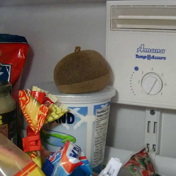 Hacer una bolsita de café molido y dejar en la parte trasera de la nevera por unos días, la bolsita debe ayudar a absorber algunos de los olores de la comida fuerte y emiten un agradable aroma a café.