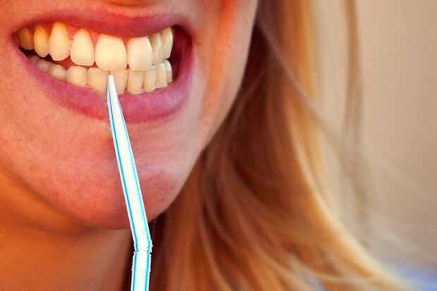 Morder el extremo de la paja plana, creando una punta afilada en el extremo. Entonces suavemente (y secretamente) usarlo como un palillo de dientes para sacar algo atorado entre los dientes. Como un bono, se puede utilizar la paja para disfrutar de su bebida y enjuáguese la boca. Si se hace correctamente, no será el más sabio.