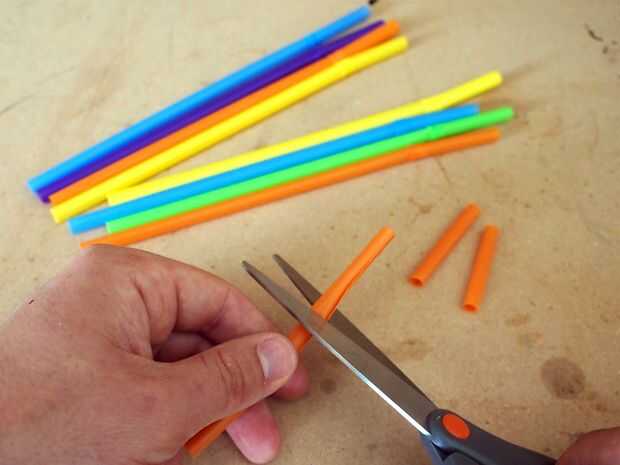 Corte la paja a lo largo, luego cortar en segmentos. La poder de pajas que se ajuste alrededor de cada radio, alternando colores o mantener un color constante en cada uno habló de todo el borde.