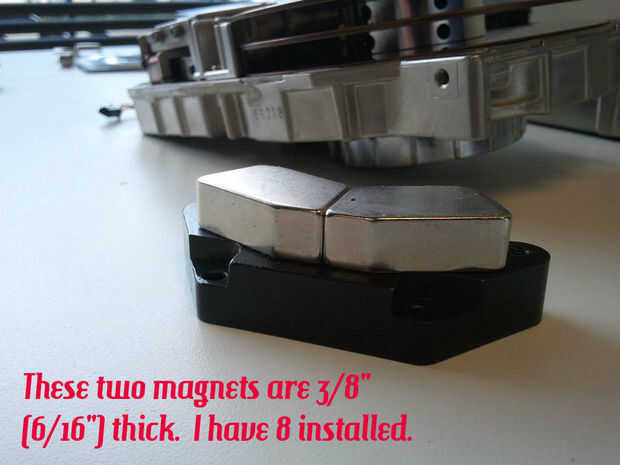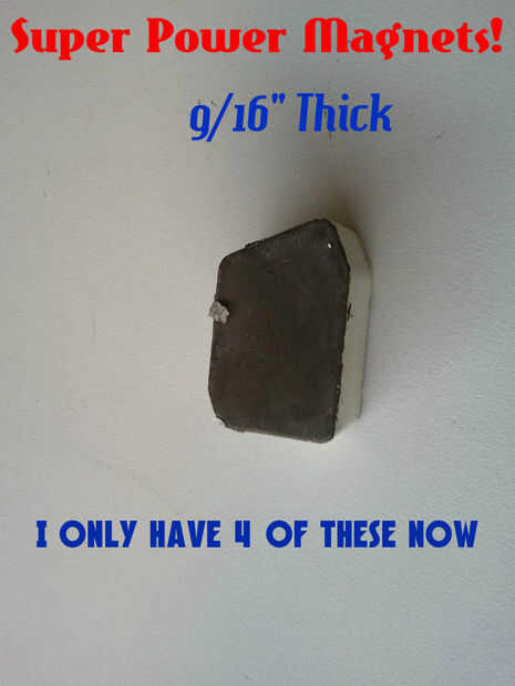 Pude solo encuentro cuatro de los más grande 9/16" espesor imanes como se ve en las fotos. Los 4 imanes son la fuerza principal detrás de carga de las baterías. Entonces encontré ocho 3/8"(6/16 de pulgada) imanes que ayude a algunos. Los restantes 30 imanes son sólo aproximadamente 1/8"(2/16 de pulgada) espesor y simplemente ayudar a agregar peso para el efecto de rueda volante. Esto es donde tenemos que mejorar la potencia en la versión próxima de que cubre la rueda entera con igualmente super imanes.
