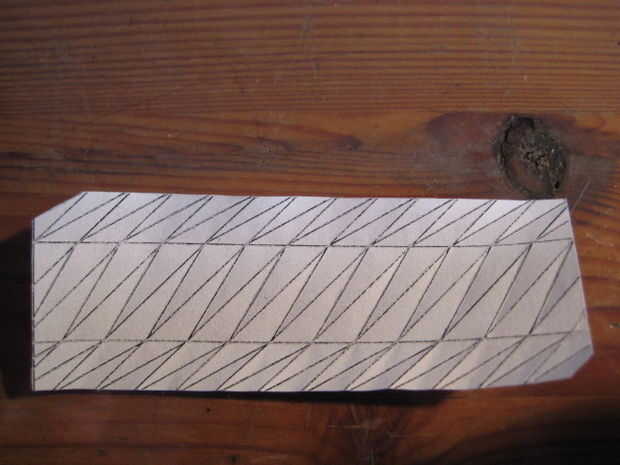 En el primer corte a lo largo de las líneas negras (PDF), luego prefold el patrón.