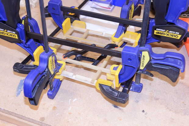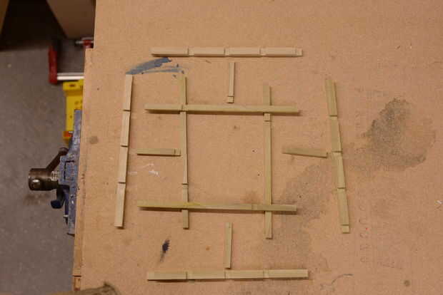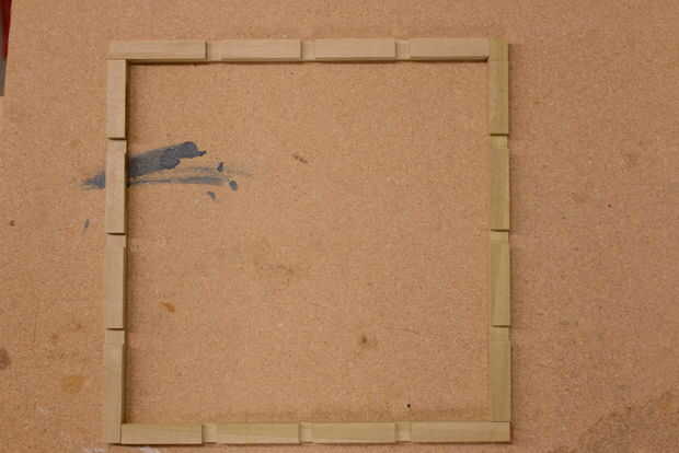 No le puedo dar un montón de consejos aquí además de tener un montón de pinzas de mano. Puede utilizar un pegamento con un largo tiempo, de trabajo, usted necesitará hacer perfectamente cuadrado. Lo hice pegado hasta en 2 pasos, poniendo el largo fuera y dentro de las tiras juntos primero, y añadiendo el corto tiras de segundo. Puede hacerlo en tres pasos, sólo asegúrese de que esté perfectamente cuadrado cada vez.