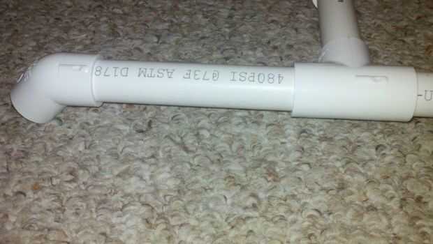 Luego pegar los tres codos de 45 grados.  Asegúrese de que está apuntando hacia abajo.   Esto eleva el soporte de tres puntos y mejora enormemente la estabilidad.