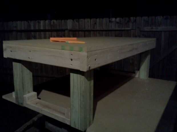 Paso 3: voltee el marco con la tapa hacia abajo.  Formato de cuatro 16 1/2" patas de 4 x 4, coloque las piernas usando cuatro tornillos de 2 pulgadas y dos de 3 pulgadas pernos por pata en cada esquina del marco interior.  Ver fotos para la configuración de las piernas y ubicación del tornillo.  Asegúrese de que los taladre primero agujeros piloto para este paso, para evitar que la madera de la división.  Si desea, puede Agregar probablemente algunos soportes en "L" en el interior de las patas de apoyo adicional.  Asegúrese de que fije los soportes a la estructura y no la tapa del MDF.