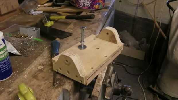 Montado la base para el resto de la herramienta que se desliza a lo largo del cuerpo principal del torno, se hace atornillando Porras a ambos lados dobló para arriba de la parte inferior y taladrar los agujeros para los pernos asegurar la base para el resto de la herramienta entonces pegados y atornillados los soportes inferiores en.