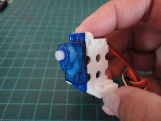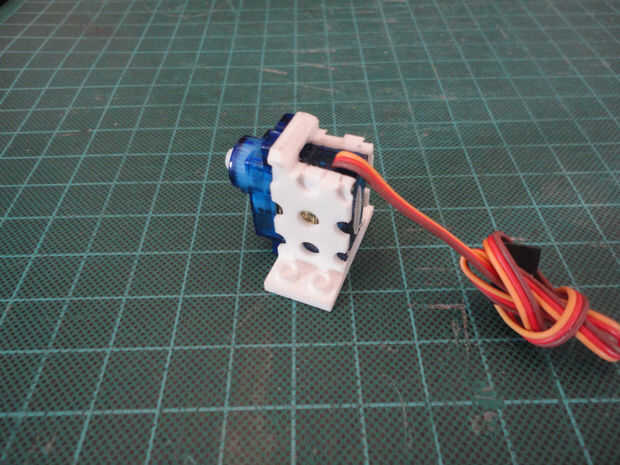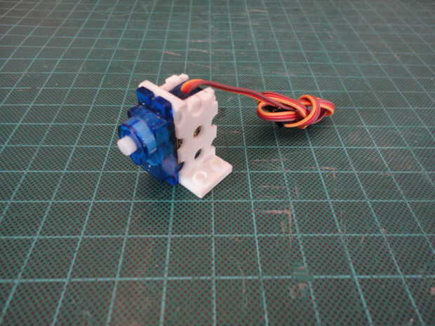 La apertura en el 3D impreso en la parte superior de montaje de servo es para el cableado de los servos. El montaje del Servo tiene LEGO compatible pletina en la parte inferior.