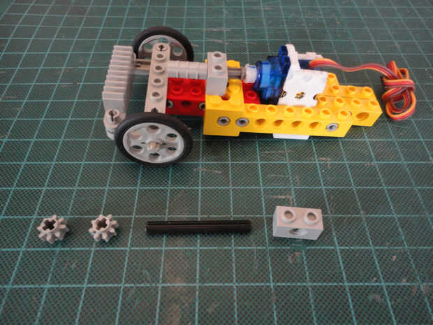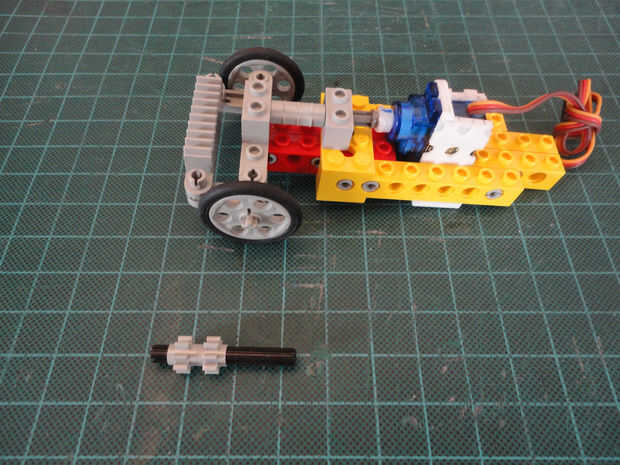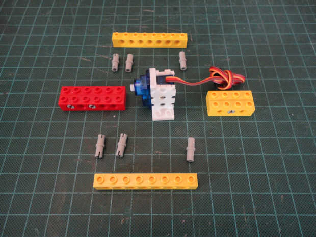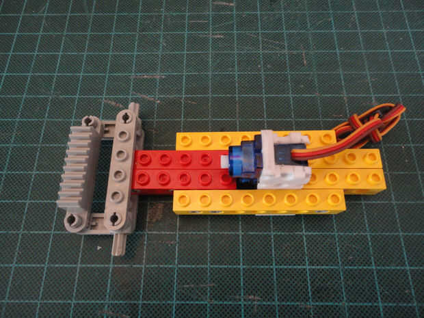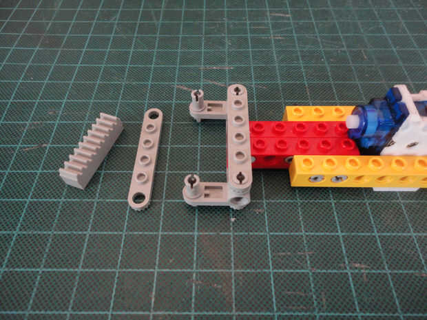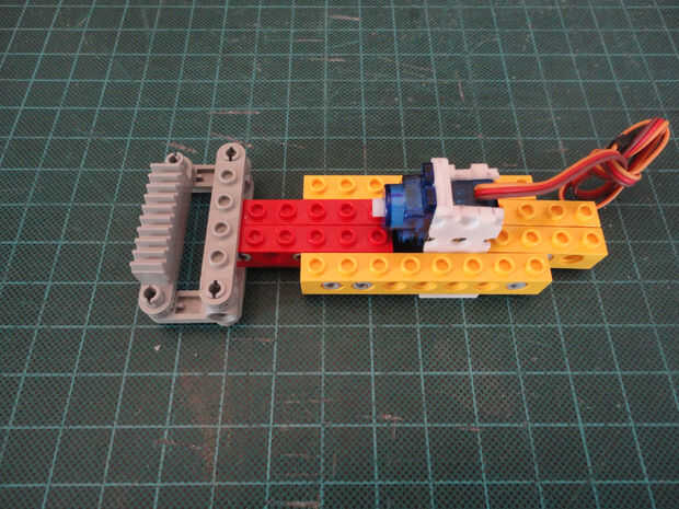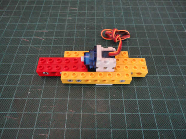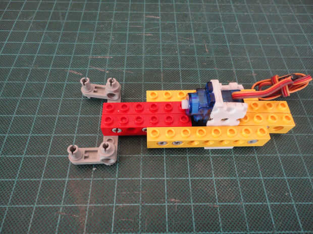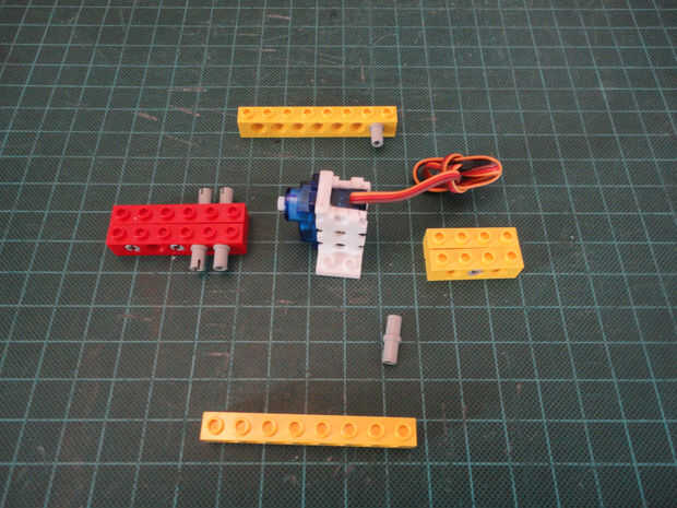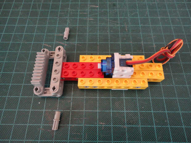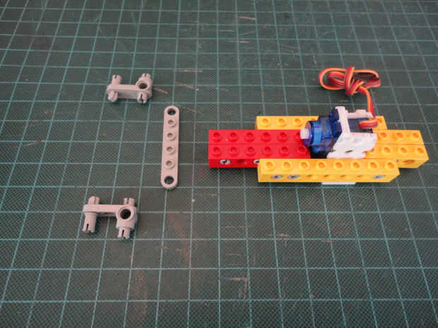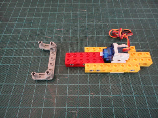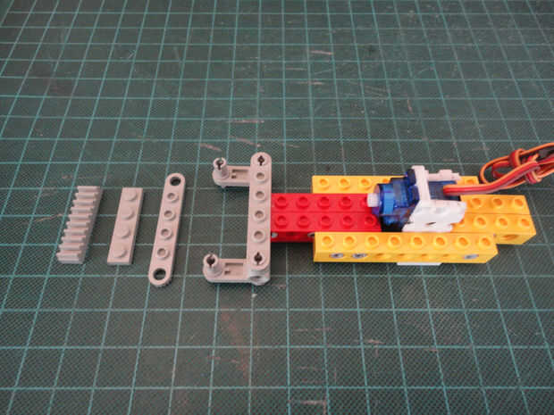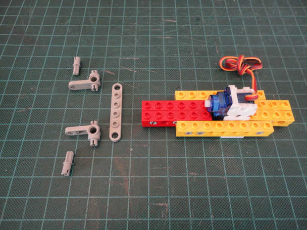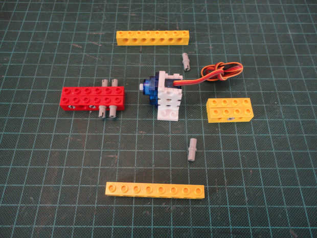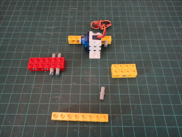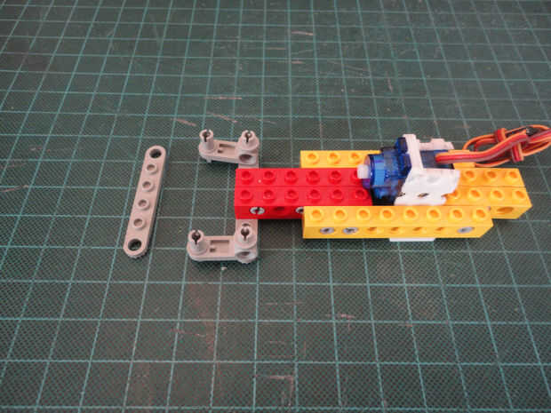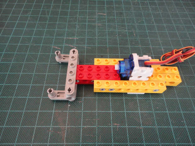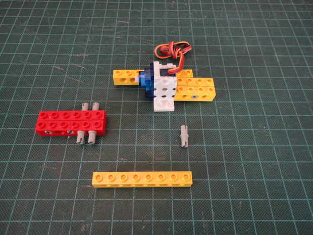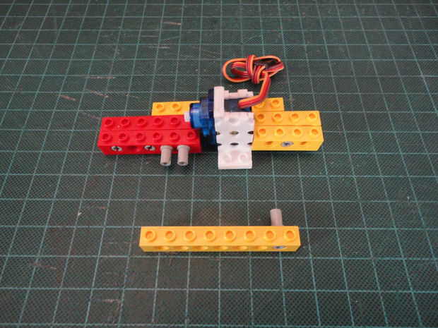 Foto 4, 5, 6, 7, 8, 9, 10 Dos de 1 x 8 ladrillos Technic (#3702), clavija de conector de seis (#3673), y servo de 9g en servo montaje del último paso.