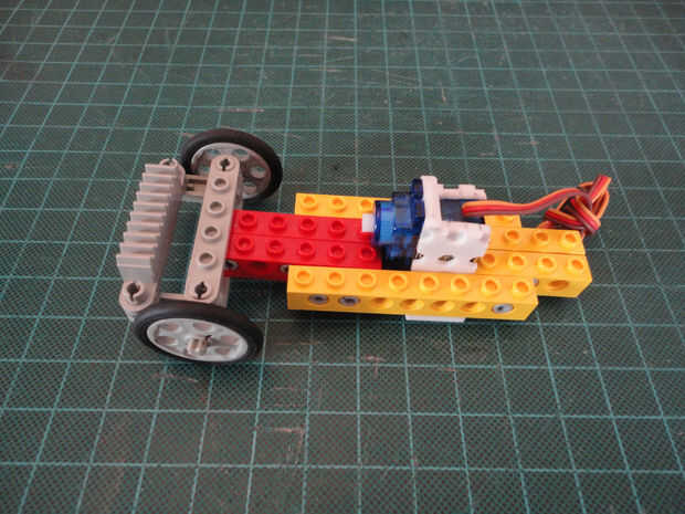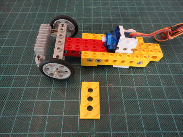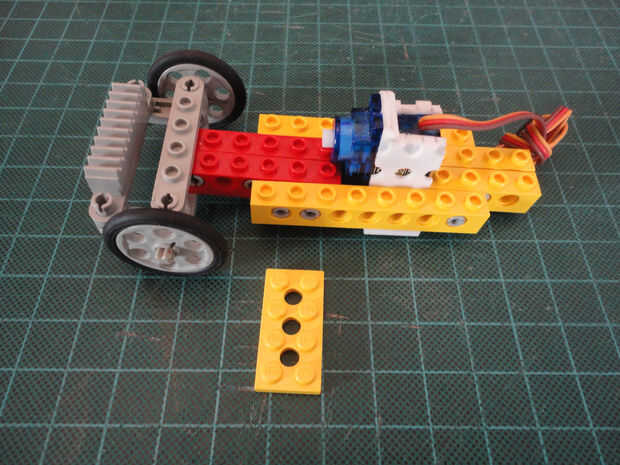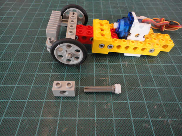 Foto 29, 30, 31 Técnica Brick 1 X 2, Ø4.9 (#3700) y Cruz del eje 3M con la perilla (#6587) pegado a Cuerno del servo.