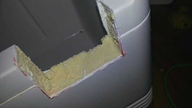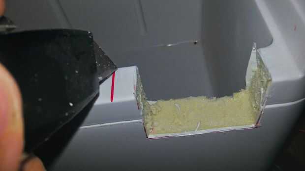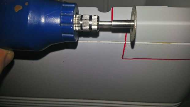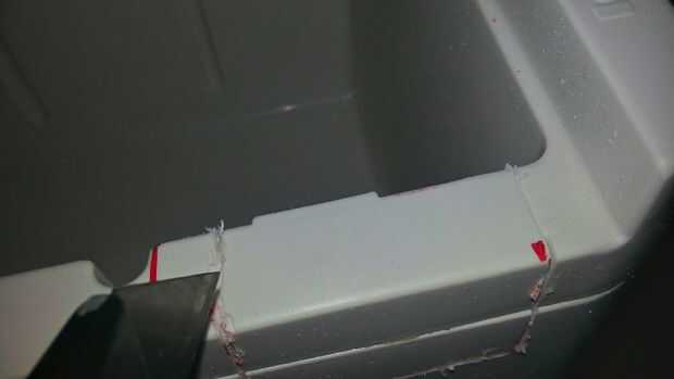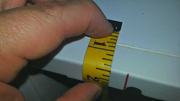 Decidí montar el dispositivo en el borde delantero derecho superior de la nevera, así que medí el tamaño de la abertura Un poco más pequeña que la necesaria. Una vez dibujé mis líneas, utiliza mi herramienta giratoria para marcar el plástico y acabado con la maquinilla de afeitar. Luego prueba ajuste la pieza y corte, hasta que fue perfecta, luego habían hundido el borde del tornillo para que quede al ras con el resto de la nevera. Usted debe disparar para un buen ajuste apretado. Una vez que estés feliz, retire el dispositivo y dejar de lado.