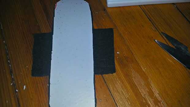 A continuación, cortar unas tiras de la alfombra y envolver alrededor del centro de las piezas acabadas, haciendo bolsillos para cosas. Pegarlos en su lugar con el adhesivo en aerosol.