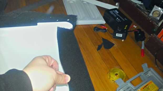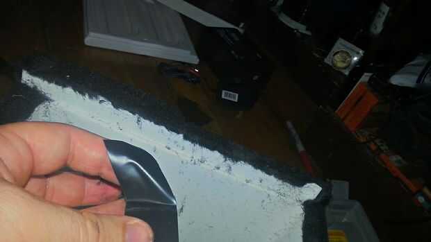 Las probabilidades son, la parte superior de su refrigerador tiene un montón de formas para envolver. Empieza con un borde, aplicar un pequeño adhesivo en aerosol a la parte del refrigerador se encuentra cubierta y estira la alfombra alrededor de él. Utilice su herramienta rotativa y disco de corte para realizar pequeños cortes en la alfombra como vas a cerrar las costuras y quitar exceso. (Sí, dije herramienta giratoria - el disco funciona bien en la tela de la alfombra y es preciso real) Ir a la derecha hasta el borde superior. lo mismo para los lados restantes. A continuación, utilizar alguna cinta aislante en el interior borde para mantener la alfombra de la peladura para arriba del uso.