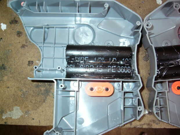 Epoxy no funciona bien para este trabajo porque es demasiado que moquea y costoso poner mucho en la acción. En cambio, he utilizado pegamento caliente del derretimiento para colocar el tubo en la bolsa y funciona de maravilla. En este lugar cabe en mi hombro y la mejilla perfectamente a aline mi ojo con los lugares de interés.