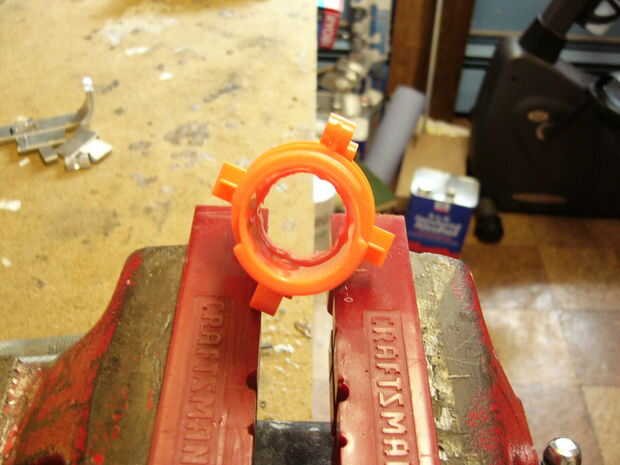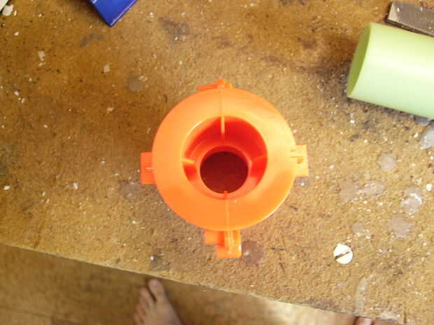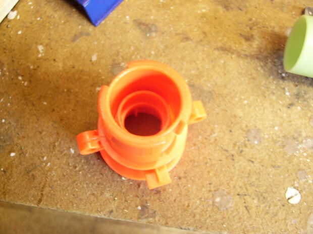 Así que estaba jugando alrededor mientras esperando algunos epoxy secar y pensaban sobre el uso de la boca naranja para hacer el arma más agradable estéticamente. El único problema enfrentó fue que el 1/2" encajaba Tacho de pvc estaba instalando a través de él. Solución: lo de la tripa.