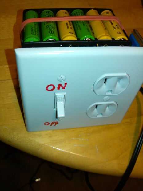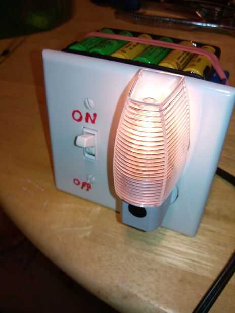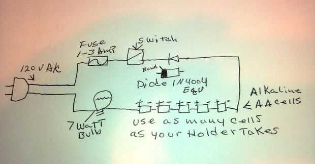 La corriente continua pulsante atraviesa las baterías en el paquete de energía y en una resistencia de carga que va a ser el foco de luz. De la bombilla de luz interruptores instalados y entonces el poder se remonta a la toma de corriente. También se recomienda un fusible en el circuito.