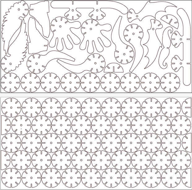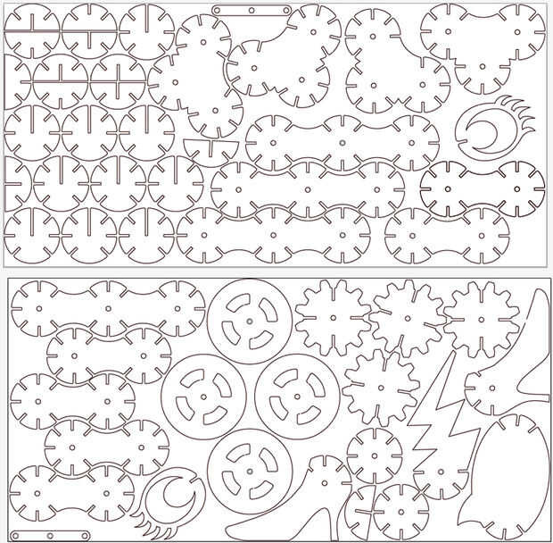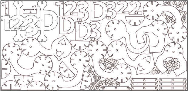Kit final tuvo un par de cientos de piezas y puede ser cortado con láser de cinco 31" por 15" pedazos de cartón single ply. Puedes ver aquí cómo todos los engranajes, esquís, las piernas y varios otros apéndices siguen el mismo esquema básico de los discos simples.