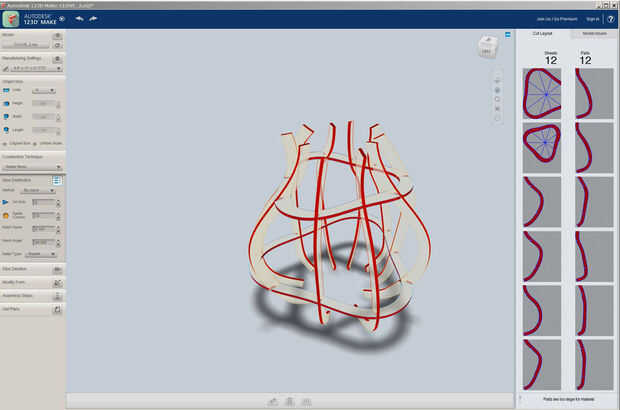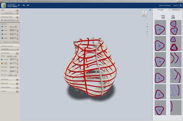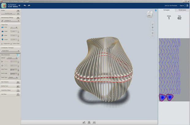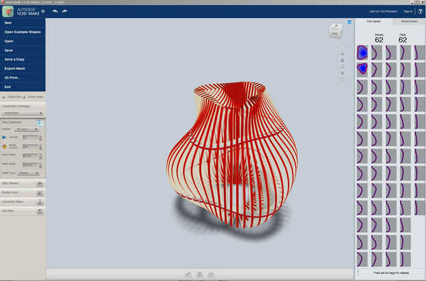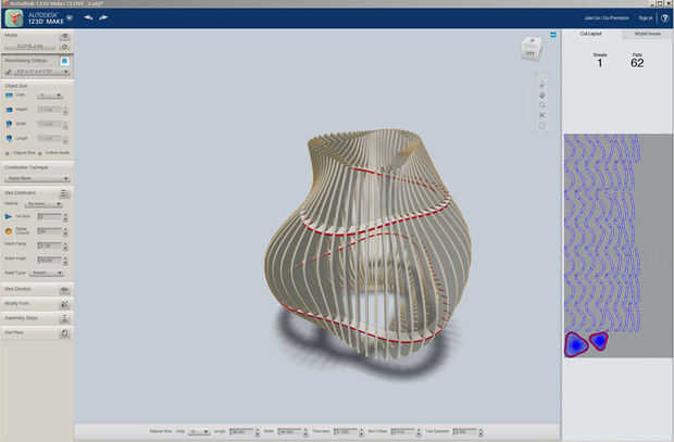 El valor predeterminado en el 123D de corte es 10 rebanadas radialmente y 10 en el eje vertical. Sólo quería 2 en el Z o el eje vertical y quería como muchos posible radialmente. Jugaba con el número de ajuste hasta que me dieron una densidad que se veía bien - para este modelo en particular 60 rodajas radiales era sobre todos los que podrían caber sin colisionar. La colocación por defecto de 2 rebanadas en el eje Z no era ideal, pero que no era un problema, puede utilizar el cursor para resaltar una rebanada en el modelo, y haga clic en él - entonces puede arrastrar una pieza en la posición deseada. Que tienes que hacer esto visualmente pues creo no hay ninguna entrada numérica disponible, pero usted todavía puede obtener bastante estrecha si tiene un ángulo de visión bueno!