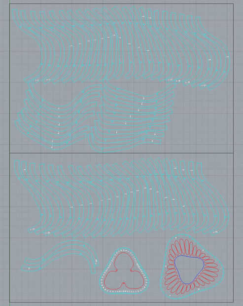 Después de exportar el. DXF, abre en su programa de CAD de elección y organizar las piezas, hacer ajustes, etc.. Pude anidar manualmente todos los perfiles de 60 costilla y los 2 anillos (2) hojas de 24 "x 36". Puse todas las piezas en un orden secuencial. Por alguna razón 123D pone las costillas sin ningún orden aparente. Las piezas están numeradas, pero esto necesariamente no hace más fácil que las piezas se anidan en forma secuencial. También compensar y recortado los aros de mi agrado (por lo que el borde exterior no estaba al ras de las costillas) y añadido algunas características (para suspender la pantalla con un accesorio universal que había previamente diseñado y) dependiendo de la máquina usted intención de cortar, probablemente ahora es un buen momento a nombre y ordenar las capas para corte - grabado , seguido de pequeños agujeros, seguidos por los perfiles exteriores y así sucesivamente.