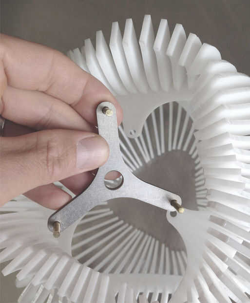 Por último es colgar la lámpara en un accesorio. Para esta particular lámpara que utiliza un soporte universal que diseñé para otras lámparas - utiliza un contacto de 3 puntos (tacos ⅛"a través de orificios alineados en el anillo superior de la pantalla) para mantener la cortina en su lugar. Este es el último paso, pero obviamente usted debe pensar el método de accesorio de suspensión desde el principio en el proceso de diseño.
