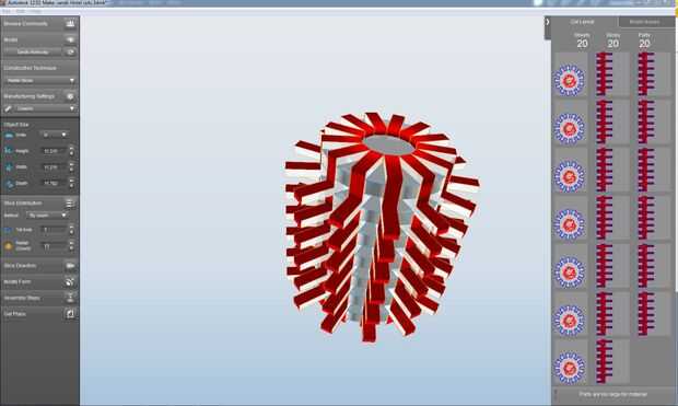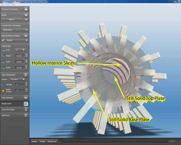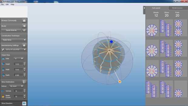 Una vez que las piezas se orientan correctamente, se puede jugar con los controles en la sección de sector distribución - esto es donde las cosas se ponen interesantes. 123D make construirá un modelo de la forma que es básicamente un marco de "material" y "espacios abiertos" si alguna vez has tomado una clase de arte, probablemente recuerdes la relación entre materiales y ningún material es lo que hace cosas interesantes. Jugar con esta relación mediante el ajuste de los números en la sección de distribución del sector. Como se trata de una lámpara, dan pensado cuánto luz filtrada desea vs cuánto directa. Como jugar con estos números te darás cuenta que 123D hacen actualizaciones y automáticamente construye la lista de "corte" de piezas que serán necesarios para crear el modelo en el lado derecho de la pantalla. Si tiene artículos de corte a mano, mantener un ojo sobre lo que está creando para evitar abrumadoras mano corte - si estás enviando tu trabajo - mantener un ojo en él para mantenerse dentro de presupuesto.