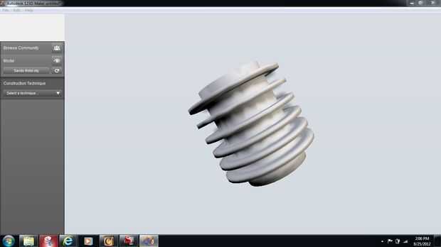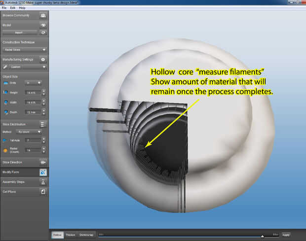 Por último, 123D MAKE no tiene idea lo que va a utilizar el fantástico modelo, así que no sé para recordarle que en este momento hay cabida para una bombilla de luz o el espacio vacío alrededor de la bombilla de luz necesario para evitar que el modelo de fusión. Sin embargo le ayudará a crear ese espacio. Antes, girar el modelo (mantenga pulsado el botón derecho del ratón y el ratón alrededor del rodillo) para que quede de una manera que le permitirá ver a través del modelo si se tratara de una lámpara. Desde el panel de control a la izquierda, seleccione el botón modificar de la forma. En la parte inferior de la pantalla, seleccione la ficha hueco utilizando los controles, deslice el regulador hasta la cavidad hueco creando alcanza el tamaño necesario. ¿Cuánto es eso? Bueno, depende de muchas cosas. Mi mejor sugerencia es que abren tan amplia como sea posible y usar una bombilla de baja potencia para reducir salida de calor. Un artista no soy ingeniero así que como con todo, utilizar su mejor juicio o pregúntale a un amigo que sabe lo que están haciendo.