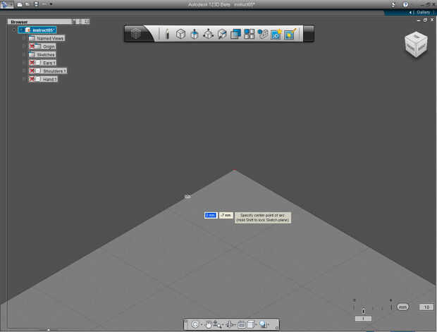 5. especificar el punto central del arco en 0, -7 coordenadas en el plano superior.
