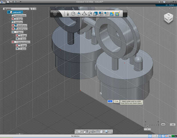 5. Mueva el ratón sobre el plano frontal y mantenga pulsada la tecla Mayús. Especificar el punto central del círculo en 5, 13 mm.