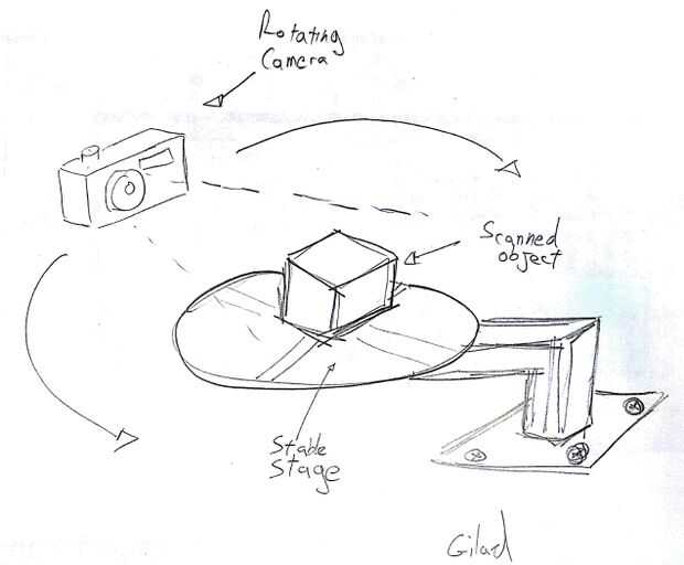 (*) La razón de que el brazo gira alrededor del objeto en su lugar, volviéndose el objeto es a propósito para trabajar el algoritmo de costura más fácil, ya que si el objeto gira, y el entorno mantiene igual, el trabajo de software se complica y el modelo no funciona tan bien, medio ambiente-como fuentes de luz, sombras y todo. (Que construido un modelo con etapa vuelta pero los resultados fueron horribles)
