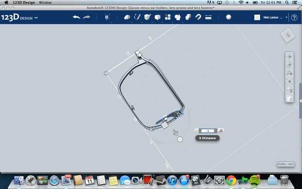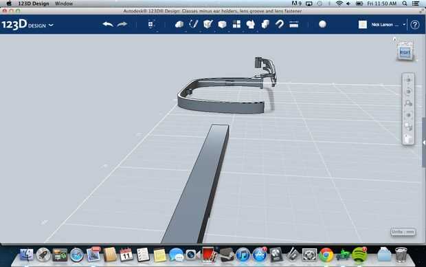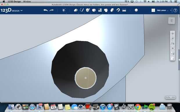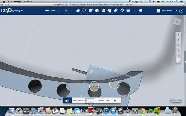 Bueno ahora mover y girar la forma del brazo de su templo para que esté en su posición exacta detrás del marco. Usted quiere asegurarse de que tienes dónde piensa que detrás del marco. Ahora acercar mucho y posición usted mismo para que busca a través de la parte superior "brazo ajuste agujero" de la estructura hacia abajo en la parte superior del brazo de templo. Salir la herramienta de círculo y haz un círculo en la parte superior del brazo del templo de sobre .985mm y arrástrelo alrededor para que coincida con el círculo de la estructura. Pan por el segundo "orificio de ajuste del brazo del" y hacer lo mismo. Arrastre su brazo del templo y los dos círculos que acaba de hacer en el positivo X dirección para fuera del camino del marco (Anote o recuerde cuánto), no se líe con las direcciones Y y Z.