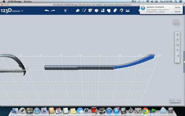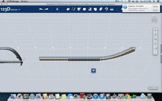 Ahora seleccione la cara de la forma del brazo de su templo y para sacar a un ancho que se ve bien a usted (creo que mía fue de 4mm si mal recuerdo.). Esta parte es opcional, pero utilicé la herramienta polilínea para separar la uno cara en nuestra forma en tres caras. Luego selecciona la cara media y utiliza el empuje / tire tool para hacer un poco más delgado y luego hizo lo mismo y la cara derecha lejos excepto un poco más delgado que la media. La idea de era por lo que podrían ser un poco flexible y por lo tanto, ajuste un poco mejor y ser un poco más "universal".