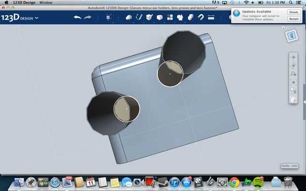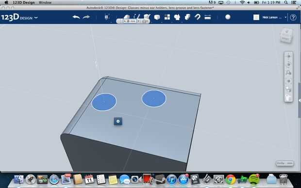 Ahora selecciona ambos de los círculos en la parte superior del brazo del templo y les saca un poco más que el ancho de su marco en la dirección Z positiva. Mi ancho de marco fue 4mm por lo que sacó mi 4,1 mm. Ahora selecciona las caras encima de las protuberancias del círculo simplemente hechos y haga clic en el cuadro azul con un engranaje en él. Debe doblar hacia fuera a un menú y debería haber una opción "shell", haga clic en él. Ahora hará sus cilindros huecos en el interior y en la parte inferior tendrá un número en cómo gruesas deben ser las paredes. Puse mi 0,015 mm si mal recuerdo.