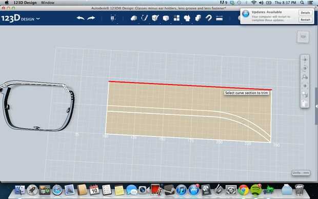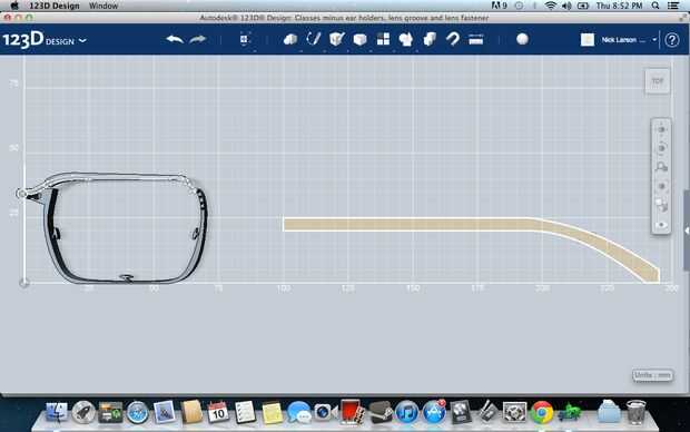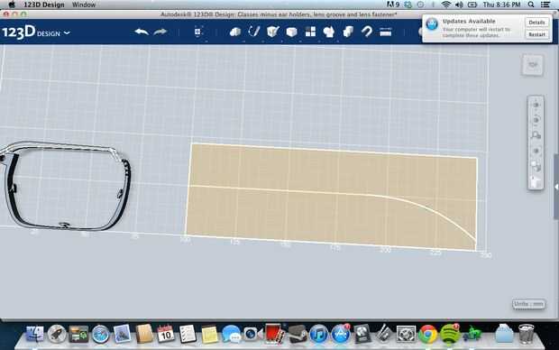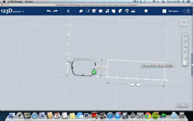 Bien, entonces vaya a la vista superior y alejar a darse en algunas habitaciones. Ir a la herramienta de rectángulo y hacer un rectángulo que es cerca de 145mm de ancho y 30mm de alto (encontré que brazos de templo más gafas son 14,5 cm y parecen caber cómoda a cada persona que encontré).. Obtener la herramienta spline y esbozar su brazo del templo. Mina era recto, pero en alrededor de 100mm creo que comenzó al resto de la forma de la curva hasta en 5mm desde el eje X. Usted puede utilizar que si usted quiere, que es otra vez de los datos que recopilé de gafas de mis compañeros. Ahora sacar la herramienta para guarnecidos y todo lo que necesita para llegar a tu bosquejo recortar.