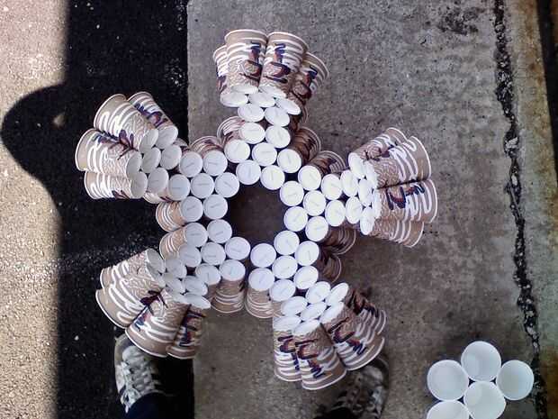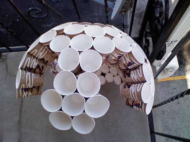 reciclaje creativo transformando cartón tazas de café de arte. Todo Collage está hecho de elementos que normalmente se tiran en una tienda de café Starbucks. Rosas se hacen de cartón tazas... hojas están hechas de cartón mangas caliente... se hace
