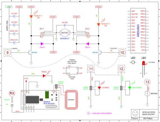 Los números en círculo rojo denotan números de pin del Arduino. Si lo desea, puede construir todo el proyecto en una sola pieza de perfboard o crear un diseño de tablero de PC. Comunicación con el chip Arduino que debe desenchufar el conector etiquetado como RX. Obtendrá un error desde el software de Arduino si dejar ese cable conectado al intentar comunicarse. Este pin es uno de los dos que se utilizan para enviar datos en serie a y desde la Junta de lector RFID a Arduino. En operación normal este pin debe ser conectado. He colocado un perno masculino en el circuito con un conector hembra que va al pin RX de la placa de circuito de Arduino. Este pin TX del etiquetado en el verde tablero RFID y está conectado al RX de la placa Arduino. Simplemente desconéctelo, subir tu bosquejo, enchufe en y todo debería estar bien.