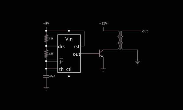 La primera sección consiste en la alimentación y los circuitos de 555 control. Toma la fuente de alimentación de batería de 12V y produce una salida de CA de 240V. El temporizador 555, configurado en el modo de oscilador astable, genera una onda cuadrada que se alimenta en la base del transistor de alta potencia. El transistor conmuta la corriente a través de la más pequeña bobina del transformador, induce un voltaje de intensificación a través de la bobina más grande.